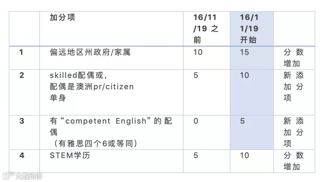 新加分项将会适用于现有的189/190/489以及之后的偏远地区技术签证491。下图是新旧打分表对比