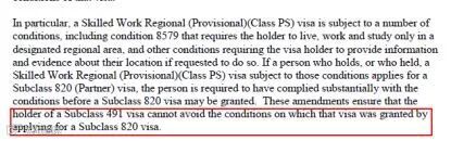 4. 配偶移民申请限制:如491或494签证持有人递交了配偶移民申请,在配偶移民签证获批前,必须继续履行491和494附带的所有条款(即持续在指定偏远地区生活、工作、学习)。只有820签证下签后,才可以离开偏远地区。