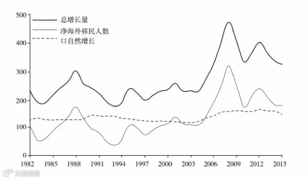从下图可以看出,澳洲人口总增长量与净海外移民人数的曲线几乎重叠,可见移民的数量深深地影响着澳洲的人口数目。