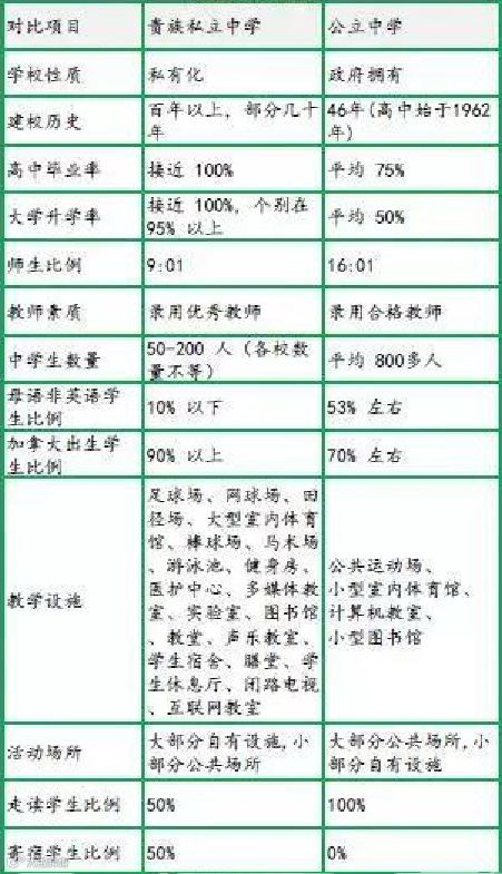 加拿大贵族私立学校与公立学校在学生规模、学生结构、师生比例、学校设施、高中毕业以及大学升学等方面都有较大的不同,主要指标对比如下: