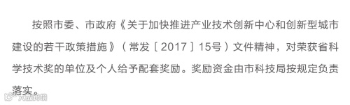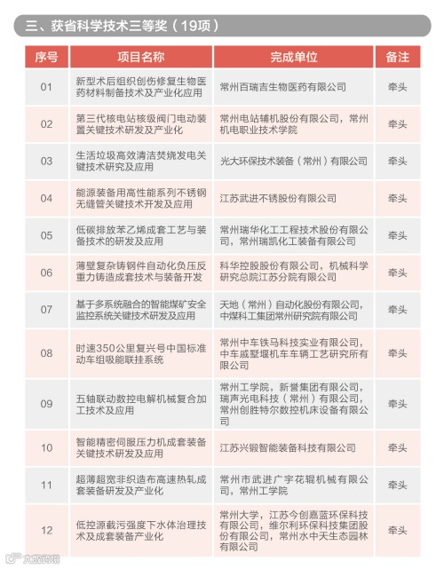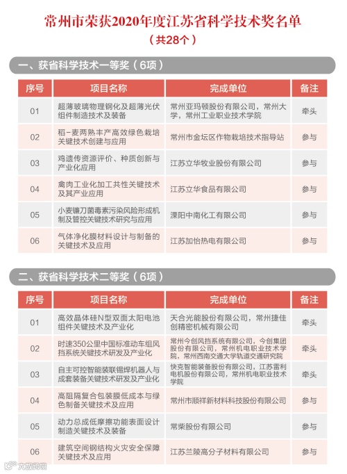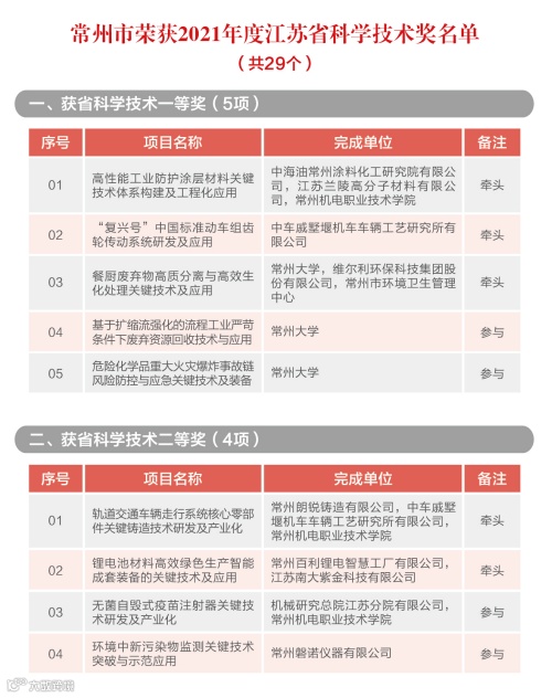 根据《省政府关于2021年度江苏省科学技术奖励的决定》(苏政发[2022]28号),常州市荣获2021年度江苏省科学技术奖奖项29个(全省奖项数283个),其中,获省科学技术一等奖5项(由我市单位牵头完成3项,创历史新高),获省科学技术二等奖4项,获省科学技术三等奖19项,获省企业技术创新奖1家。