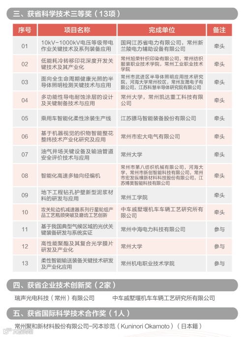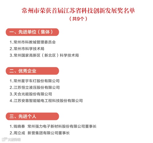 根据《省政府关于表彰首届江苏省科技创新发展奖先进单位(集体)、优秀企业、先进个人的决定》(苏政发[2021]50号),常州市荣获先进单位(集体)3家,优秀企业4家,先进个人2名。