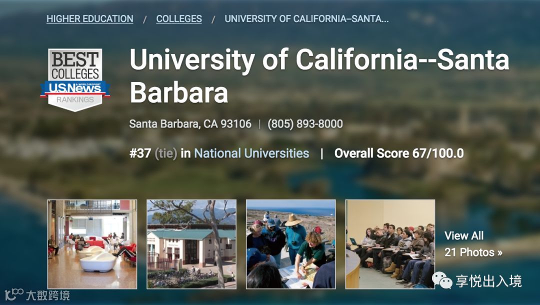 加州大学圣巴巴拉分校(英语:University of California, Santa Barbara,简称UCSB,又常被译作圣巴巴拉加州大学),是一所著名的公立研究型大学,加州大学系统的成员之一。自1972年以来,加州大学圣巴巴拉分校的教授们,在化学,物理学,经济学等领域已荣膺7个诺贝尔奖,以及数学中具有里程碑意义的菲尔茨奖。此外UCSB的现职教授中更有29位国家科学院(National Academy of Sciences)院士,27位国家工程院(National Academy of Engineering)院士以及34位艺术和科学学院(Academy of Arts and Sciences)院士。如今加州大学圣巴巴拉分校已经是全美重要的学术发展重地之一。
