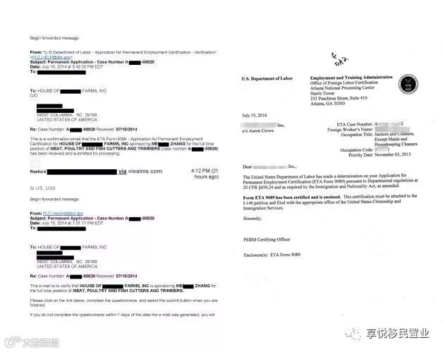 ▲美国劳工证递交确认信 / 美国劳工证批准信