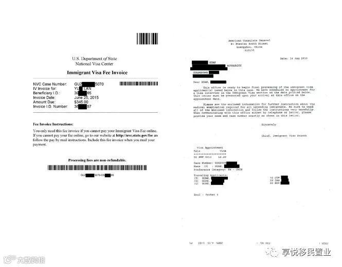 ▲美国移民签名费收费通知书 / 美国领事馆面试通知信