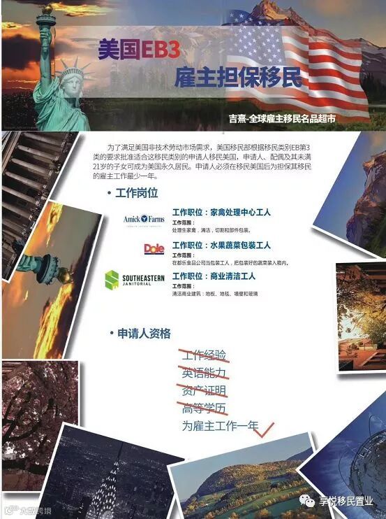 美国EB3雇主担保移民又称为美国EB3职业移民,以其独有的低资产要求、低申请条件要求、高成功率成为性价比超高,比较受欢迎的美国移民途径。美国EB3雇主担保移民是美国职业移民第三优先类,是合法的美国移民项目。