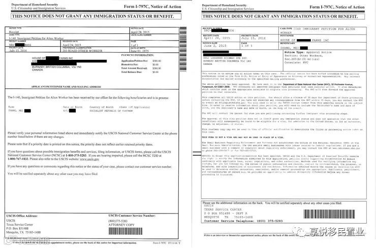 ▲美国I-140移民申请受理确认信 / 美国I-140移民申请批准信