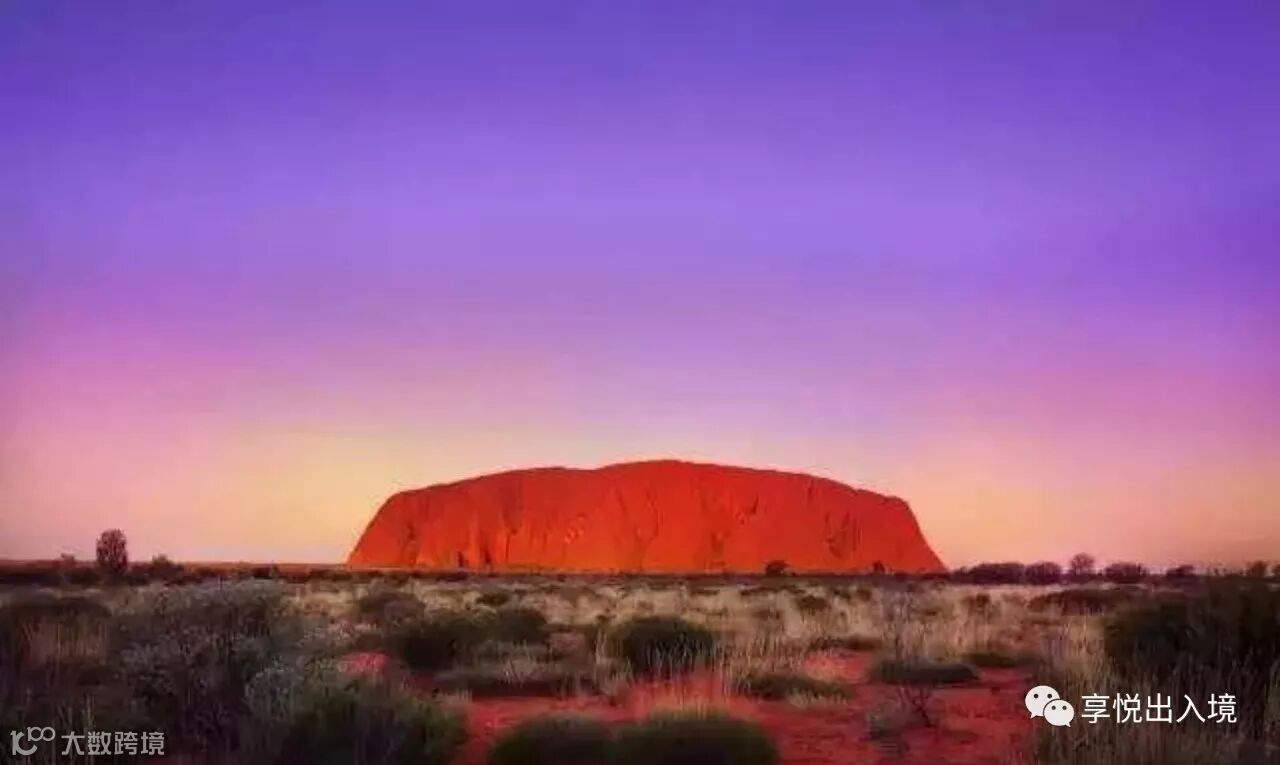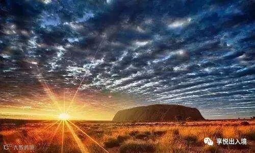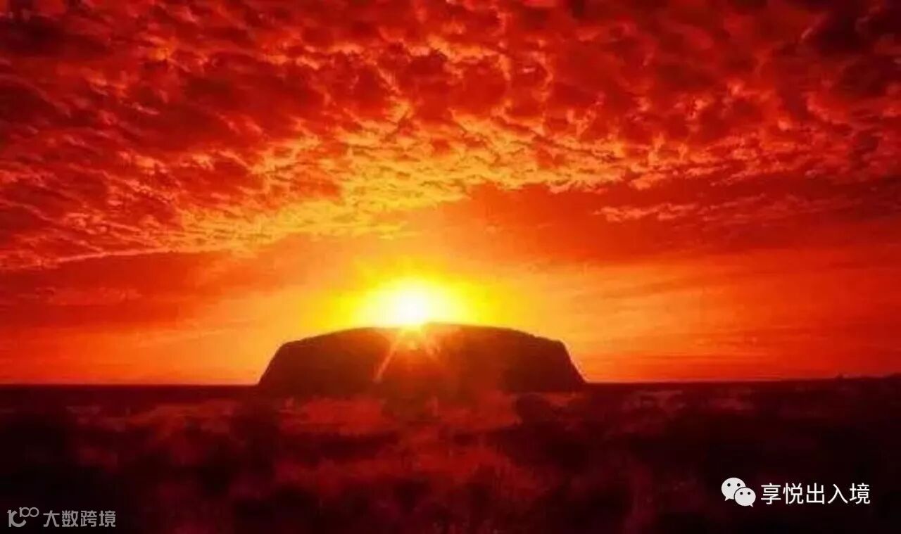 乌鲁鲁的日落是惊艳的,太阳慢慢消失于地平线,夕阳下的乌鲁鲁逐渐变换出不同颜色;随着天色渐渐暗淡,乌鲁鲁庞大的身躯越发深邃,让你充分感受到大自然的浩瀚与神秘。