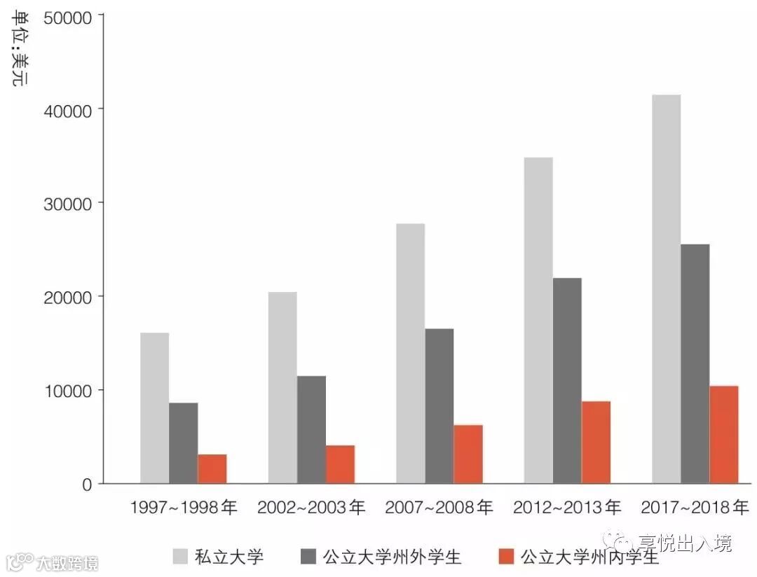 美国本科申请人数逐年增多,同时美国本科的学费也在节节攀升。最新数据显示,美国排名前100的综合大学学费2017/2018学年比上一学年平均上涨3.6%,部分学校的学费涨幅超过10%。2017/2018学年全美私立大学平均学费已达41,727美元,二十年内涨幅为157%;全美公立大学州外学生平均学费达26,010美元,二十年内涨幅为194%;全美公立大学州内学生平均学费达10,691美元,二十年内涨幅为237%。