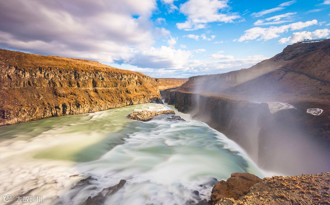 黄金瀑布和间歇泉两者之间只有十分钟的路程,是冰岛旅游的必去景点。阳光下,黄金瀑布倾泻而下,水珠弥漫,形成童话般的彩虹。