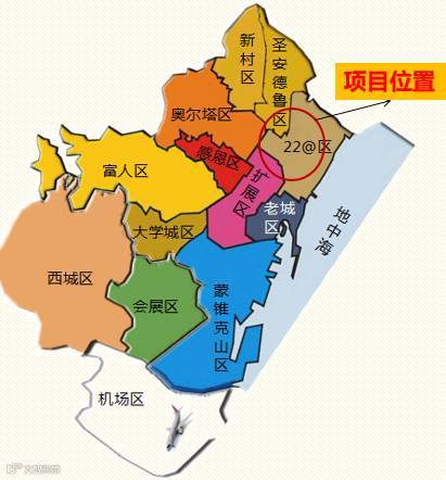 22@区:集文化、娱乐、能源、科技于一体的多元化区域。从最初的纺织工厂区转型为现在的科技型创新区,汇集了雅虎、微软、巴塞罗那天然气公司、施耐德电器等4500家企业,希尔顿、万豪酒店等多家国际豪华型酒店入驻,未来影响不容小觑。