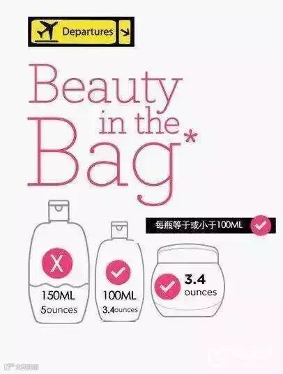 只要每个单独盛放在100ml以内的容器中,且所有物品应置于容积为1L,可重新封口的透明塑料袋中。