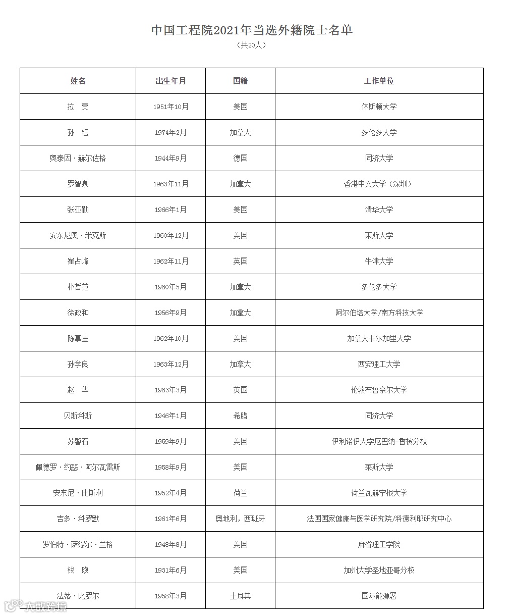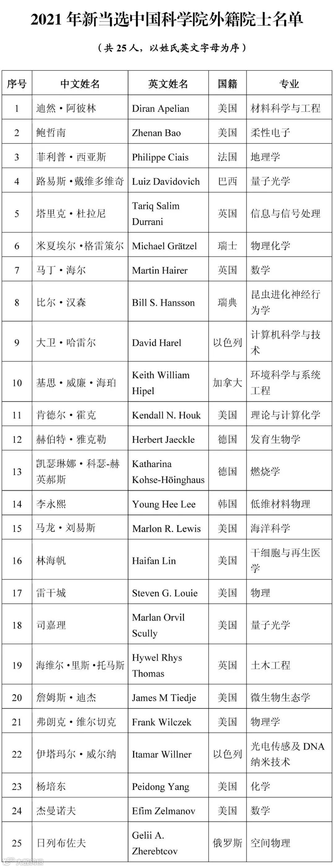此外,2021年中国科学院新当选外籍院士25人,分别来自11个国家,韩国和瑞士首次有科学家当选中国科学院外籍院士;中国工程院新当选外籍院士20人。本次增选后,中国科学院院士总数为860人,外籍院士总数为129人;中国工程院院士总数为971人,外籍院士总数为111人。