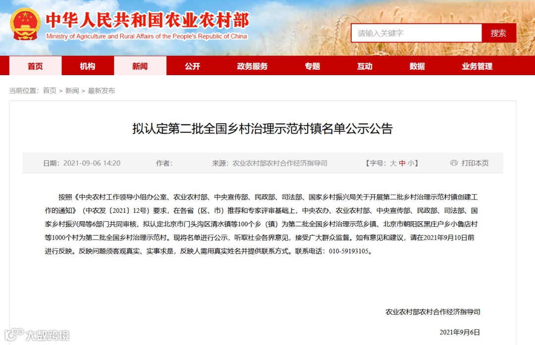 按照《中央农村工作领导小组办公室、农业农村部、中央宣传部、民政部、司法部、国家乡村振兴局关于开展第二批乡村治理示范村镇创建工作的通知》(中农发〔2021〕12号)要求,在各省(区、市)推荐和专家评审基础上,中央农办、农业农村部、中央宣传部、民政部、司法部、国家乡村振兴局等6部门共同审核,拟认定北京市门头沟区清水镇等100个乡(镇)为第二批全国乡村治理示范乡镇、北京市朝阳区黑庄户乡小鲁店村等1000个村为第二批全国乡村治理示范村。现将名单进行公示,听取社会各界意见,接受广大群众监督。如有意见和建议,请在2021年9月10日前进行反映。反映问题须客观真实、实事求是,反映人需用真实姓名并提供联系方式。联系电话:010-59193105。