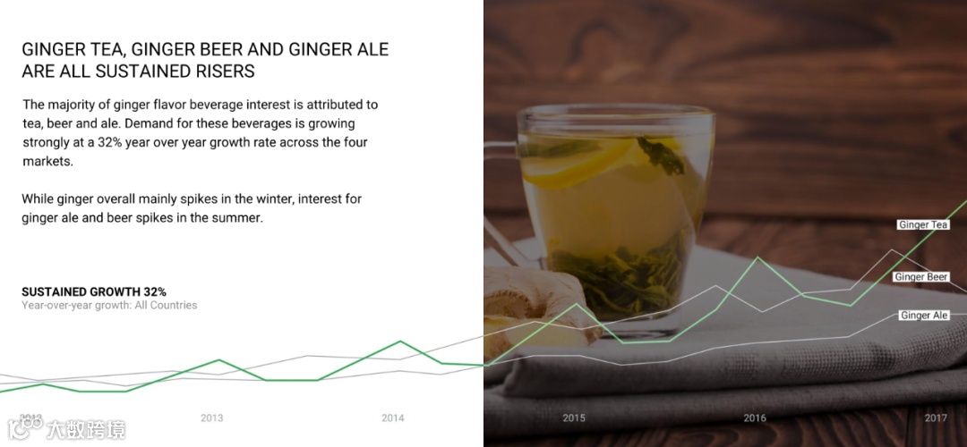 4个地区)增长率为32%,包括姜茶、姜啤和生姜汽水,生姜水、姜汁等类别的搜索量增长率为79%。