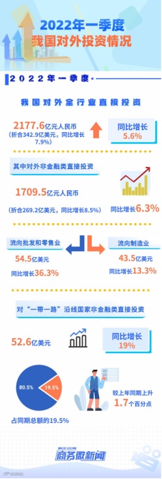 2022年一季度,我国对外全行业直接投资2177.6亿元人民币,同比增长5.6%(折合342.9亿美元,同比增长7.9%),其中对外非金融类直接投资1709.5亿元人民币,同比增长6.3%(折合269.2亿美元,同比增长8.5%)。其中,流向批发和零售业54.5亿美元,同比增长36.3%,流向制造业43.5亿美元,同比增长13.3%;对“一带一路”沿线国家非金融类直接投资52.6亿美元,同比增长19%,占同期总额的19.5%,较上年同期上升1.7个百分点。