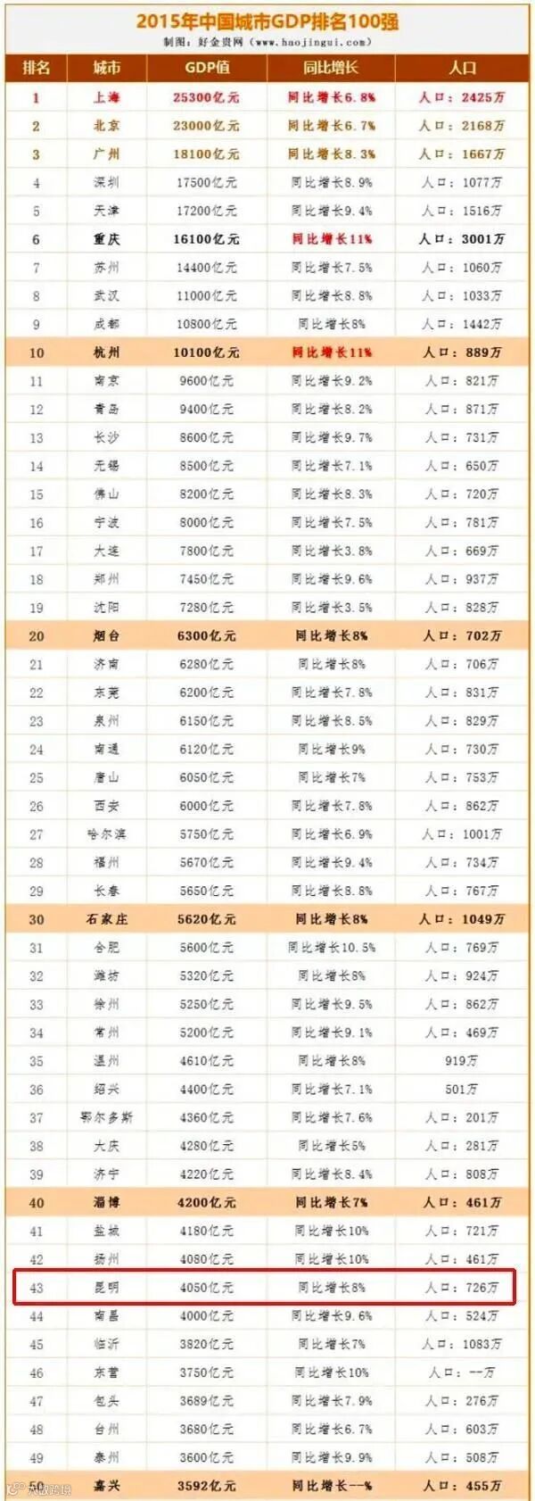变化是从2015年开始的。这一年,根据国家统计局公布的数据,昆明以4050亿元的成绩在全国城市中排名第43位,而南昌则以4000亿元排44位,被昆明反超。也是在这一年,长春、石家庄等北方城市排名开始下降。