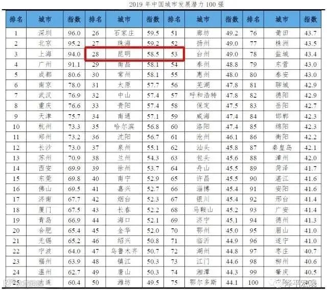 2019年5月,第一财经新一线城市研究所发布“2019城市商业魅力排行榜”,15个新一线城市排名依次为成都、杭州、重庆、武汉、西安、苏州、天津、南京、长沙、郑州、东莞、青岛、沈阳、宁波、昆明。昆明挤掉无锡,首次进入排名榜单。当时,有人看到昆明在列后质疑:昆明凭什么成为新一线城市?