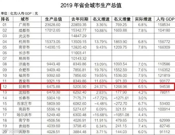 昆明发布的数据显示:2019年,昆明GDP总量在第四次全国经济普查修订数较初步核算数增加814亿元的基础上达到6475.88亿元,在全国27个省会城市中排名第12位,较2018年的第17位前进5位,超过沈阳(6470.30亿元)、长春(5904.10亿元)、石家庄(5809.90亿元)、南昌(5596.18亿元)、哈尔滨(5249.40亿元)5个城市。