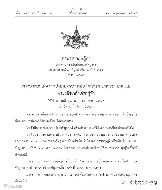 2.根据关于免征增值税的税收法颁布的皇家法令(第745号)(2022年)——该法令规定对泰国银行在其沙盒项目项下为公共用途而发行的零售央行数字货币(“CBDC”) 的交易应免除增值税纳税义务。