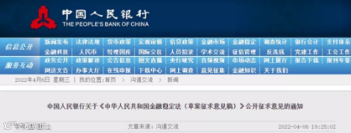 2022年4月6日,为贯彻落实党中央、国务院关于防范化解金融风险、健全金融法治的决策部署,建立维护金融稳定的长效机制,人民银行会同有关部门深入研究、反复论证,起草了《中华人民共和国金融稳定法(草案征求意见稿)》,并且正式公布,向社会公开征求意见。