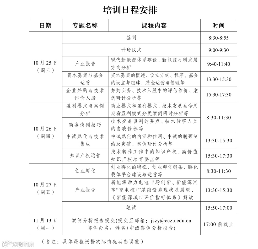 1.集中授课。按照《国家技术转移专业人员能力等级培训大纲》要求,结合新能源产业,安排相应课程模块,拟请中试熟化与技术集成、企业并购与技术作价入股、创业孵化、资金募集与基金运营、盈利模式与案例分析等专家授课,学员将完成合计不少于24学时的课程学习(详见日程安排)。
