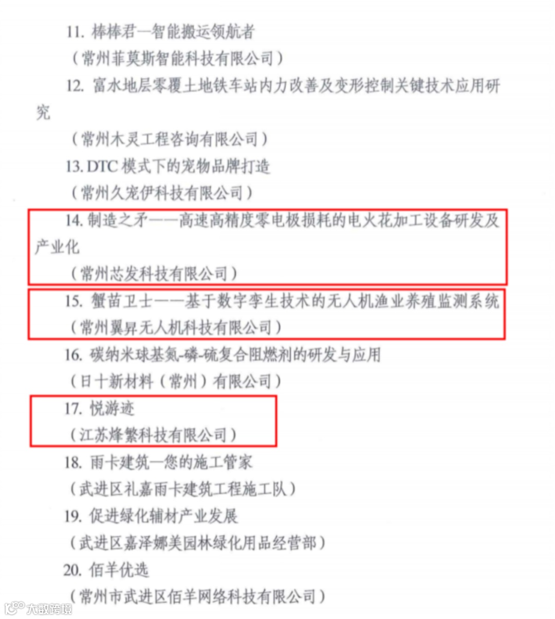 其中“零碳设备的研发及产业化”、“‘创意引领未来,AI赋能梦想’国内独家AI+数字创意平台”、“制造之矛—高速高精度零电极损耗的电火花加工设备研发及产业化”、“蟹苗卫士—基于数字孪生技术的无人机渔业养殖监测系统”均为常州大学学生项目。