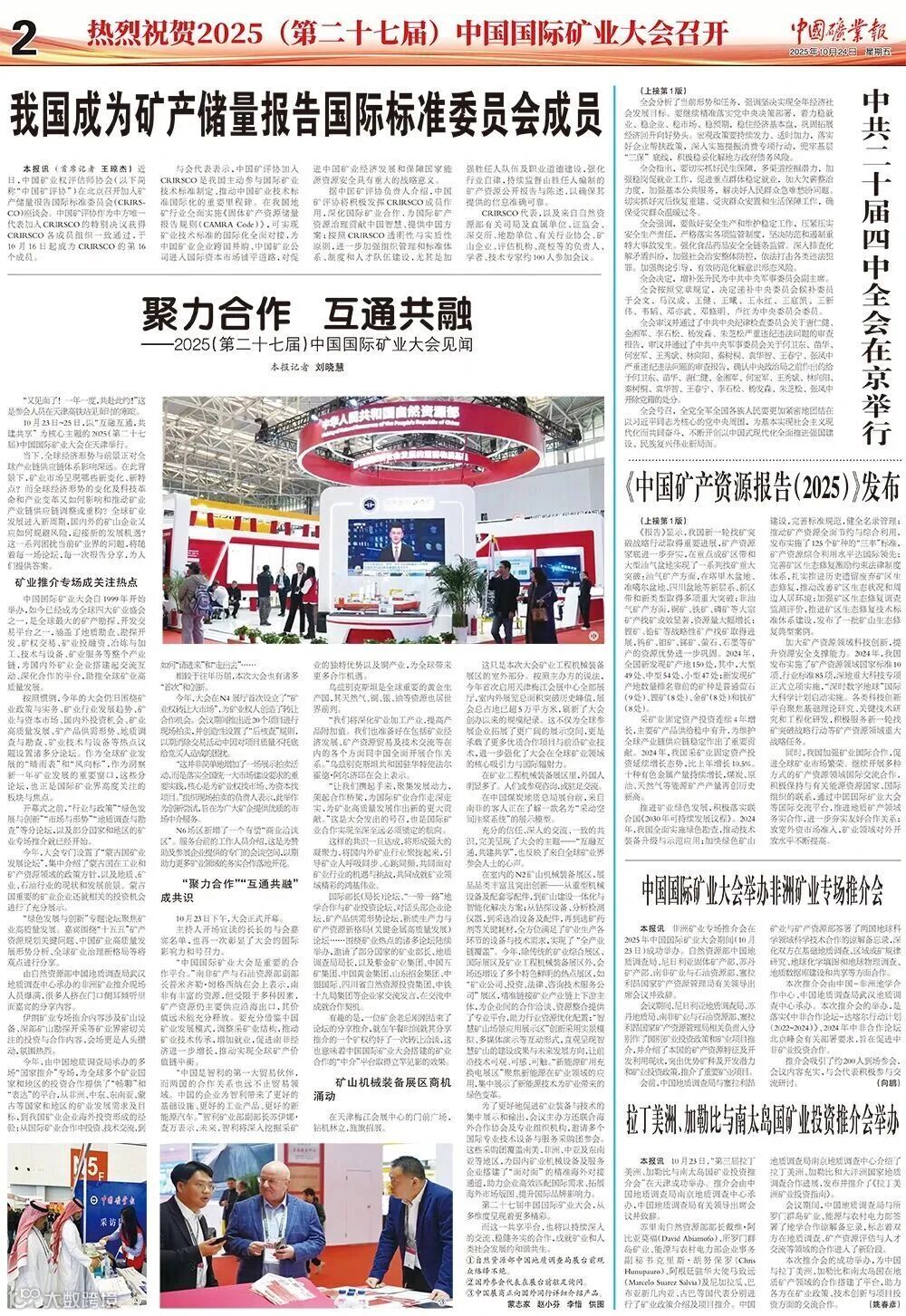 10月23日~25日,由中华人民共和国自然资源部、天津市人民政府指导,以“互融互通,共建共享” 为核心主题的2025(第二十七届)中国国际矿业大会在天津举行。彰显矿业国际合作的重要性,倡导相互了解、融通发展、互利共赢,共同促进全球矿业繁荣。