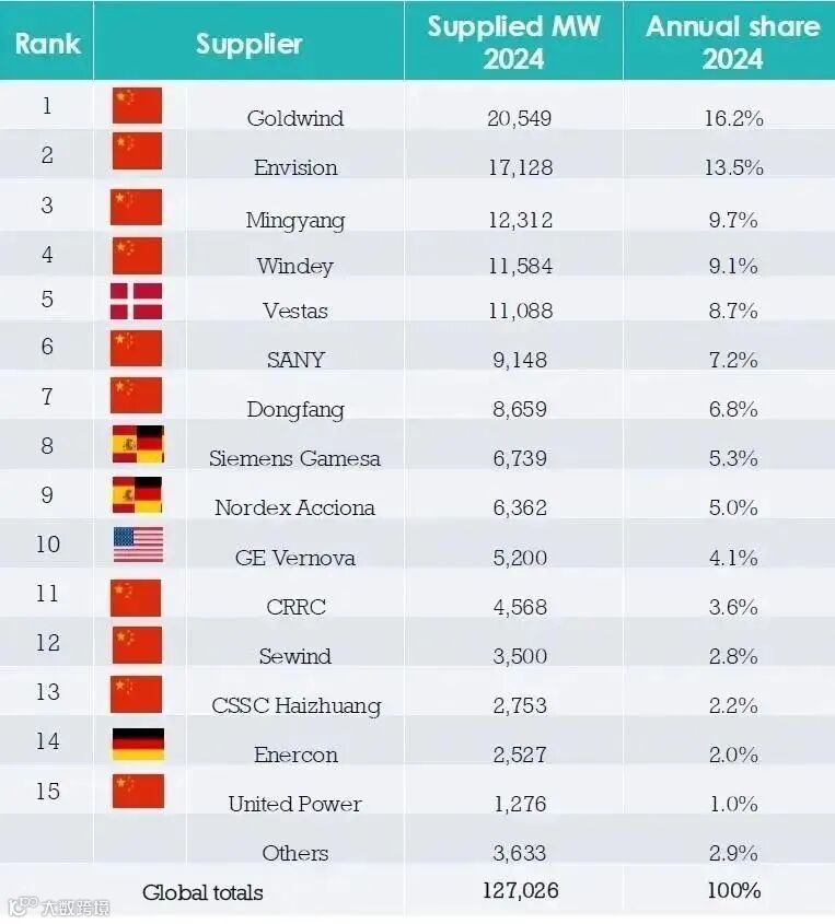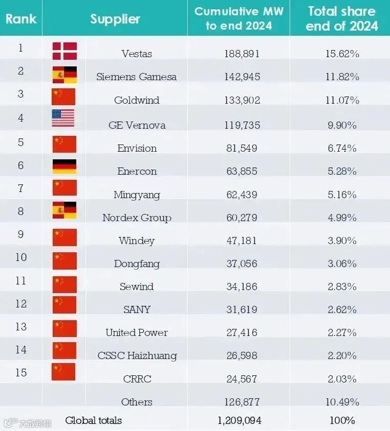 全球前四大整机商首次全部来自中国,丹麦的维斯塔斯(Vestas)排名第五。