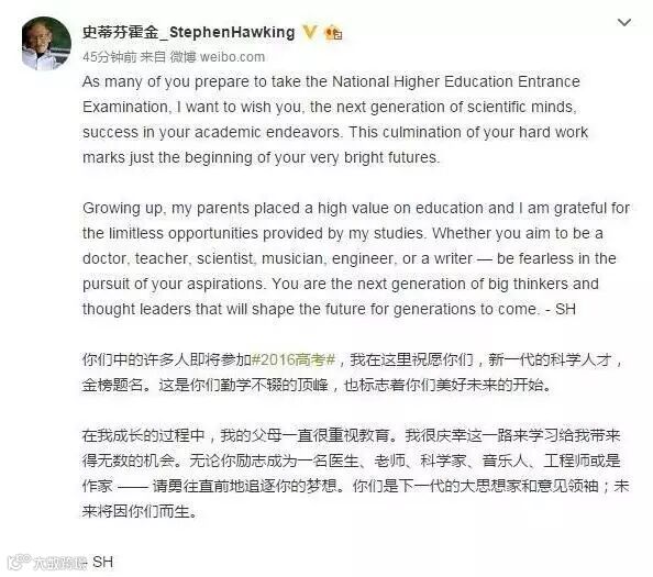 赶在高考前一天,已进驻微博的霍金贴心发微博祝福中国高考考生,“我在这里祝愿你们,新一代的科学人才,金榜题名。”