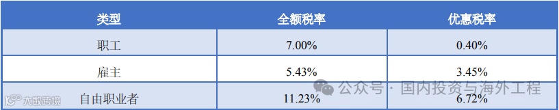 此外,大部分雇主还需为雇员购买国民健康保险以外的补充保险, 如离职保险等。根据月收入和雇佣情况的不同适用不同的保险费率,在月收入低于当年规定 标准的情况下可享受不同程度的费率优惠。凡收入低于社会平均收入60%的个人可享受优惠 税率,具体费率见下表: