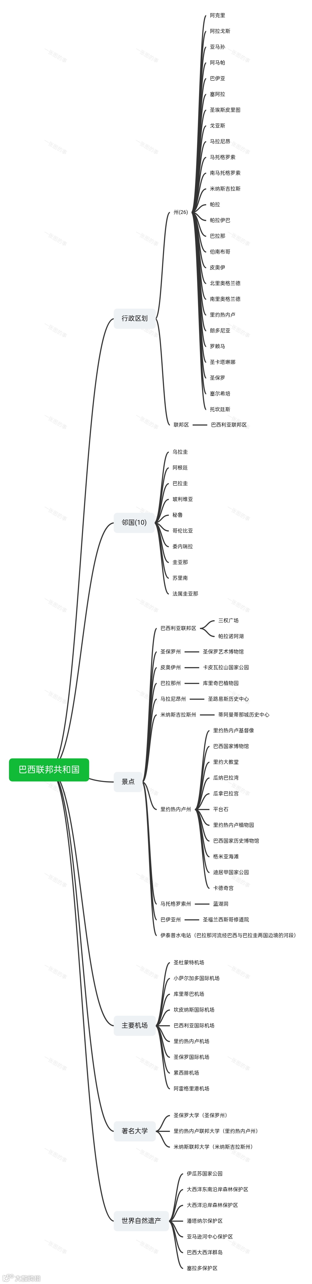 巴西分为26个州和1个联邦区,分别是:阿克雷、阿拉戈斯、亚马孙、阿马帕、巴伊 亚、塞阿拉、圣埃斯皮里图、戈亚斯、马拉尼昂、马托格罗索、南马托格罗索、米纳斯吉拉 斯、帕拉、帕拉伊巴、巴拉那、伯南布哥、皮奥伊、北里奥格朗德、南里奥格朗德、里约热 内卢、朗多尼亚、罗赖马、圣卡塔琳娜、圣保罗、塞尔希培、托坎廷斯、巴西利亚联邦区。 州下设市,全国共有5570个市。