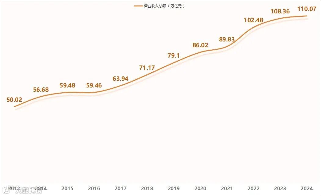 2024中国企业500强共实现营业收入110.07万亿元,迈上了110万亿元的新台阶,较上年增长1.58%;入围门槛为473.81亿元,提高3.83亿元;资产总额为428.86万亿元,增长7.28%。2024中国企业500强实现归属母公司所有者净利润45092亿元,较上年增长5.01%,增速由上年的负增长转为正增长。中国工程院院士、中国企业联合会特邀副会长王基铭认为,2023年中国500强企业坚持稳中求进,聚焦“高质量发展”这一首要任务,积极应对复杂多变的外部环境,创新发展,砥砺奋进,在保持总体规模稳步增长的同时,发展质量有了新的提升。