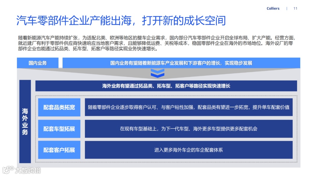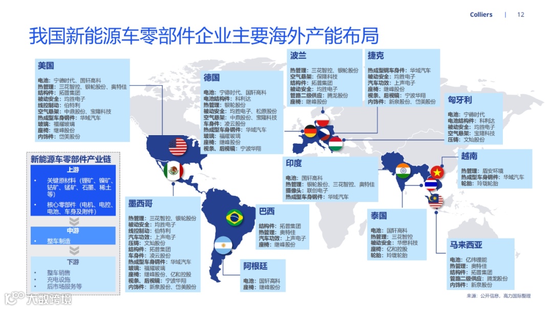 随着新能源汽车产能持续扩张,为适配北美、欧洲等地区的整车企业需求,国内部分汽车零部件企业开启全球布局、扩大产能。经营方面, 就近建厂有利于零部件供应商快速响应当地客户需求,且能够降低运费、关税等成本,稳固零部件企业在海外的市场地位。海外设厂的零 部件企业也能通过拓品类、拓车型、拓客户等路径实现业务快速增长。