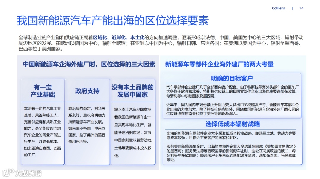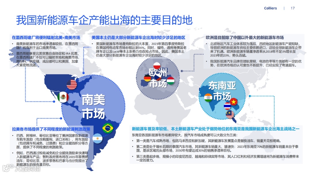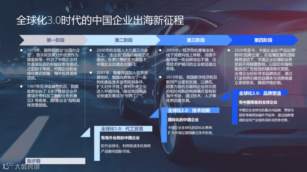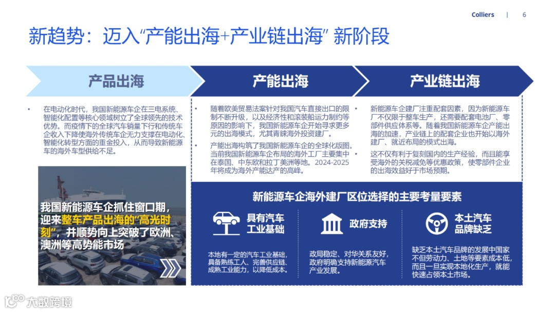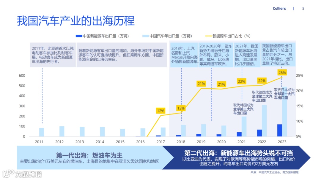 随着全球化的不断深入,中国新能源汽车产业迎来了出海的新征程。根据Colliers发布的《2024年中国新能源汽车出海洞察》报告,中国企业的全球化经历了从代工贸易到技术创新,再到品牌塑造的三个阶段。当前,中国新能源汽车正以品牌出海的全新姿态,加速在全球市场的布局。
