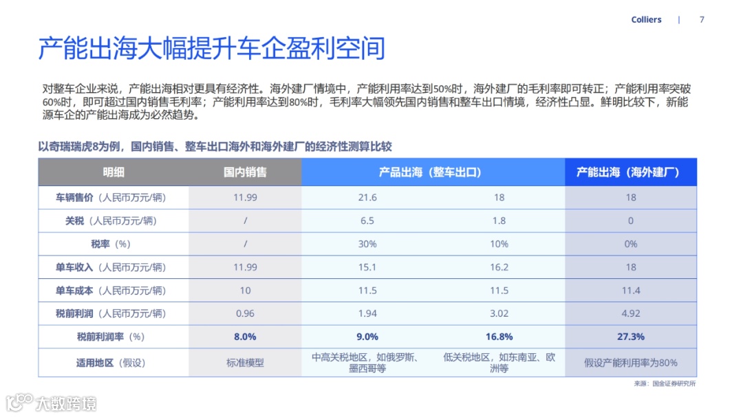 对整车企业来说,产能出海相对更具有经济性。海外建厂情境中,产能利用率达到50%时,海外建厂的毛利率即可转正;产能利用率突破 60%时,即可超过国内销售毛利率;产能利用率达到80%时,毛利率大幅领先国内销售和整车出口情境,经济性凸显。鲜明比较下,新能 源车企的产能出海成为必然趋势。