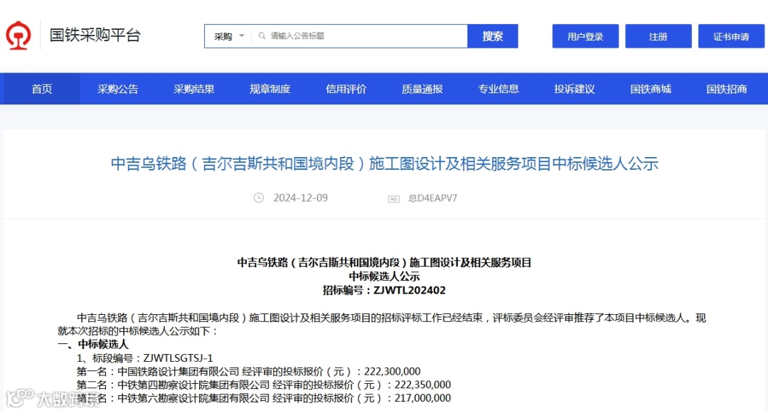 12月9日,《中吉乌铁路(吉尔吉斯共和国境内段)工程施工图审核及相关服务中标候选人公示》发布。中国铁路设计集团有限公司以2.2亿元的投标报价被列为第一中标候选人。