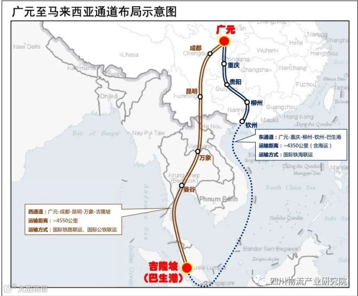 ②国际公铁联运:西部地区以广元为例,广元→万象(老挝)→吉隆坡。广元至老挝万象:采用铁路运输,铁路运输距离约2423公里,运输时效约4天;万象至吉隆坡采用公路运输,运距约2093km,运输时间约30小时;合计5-6天左右。