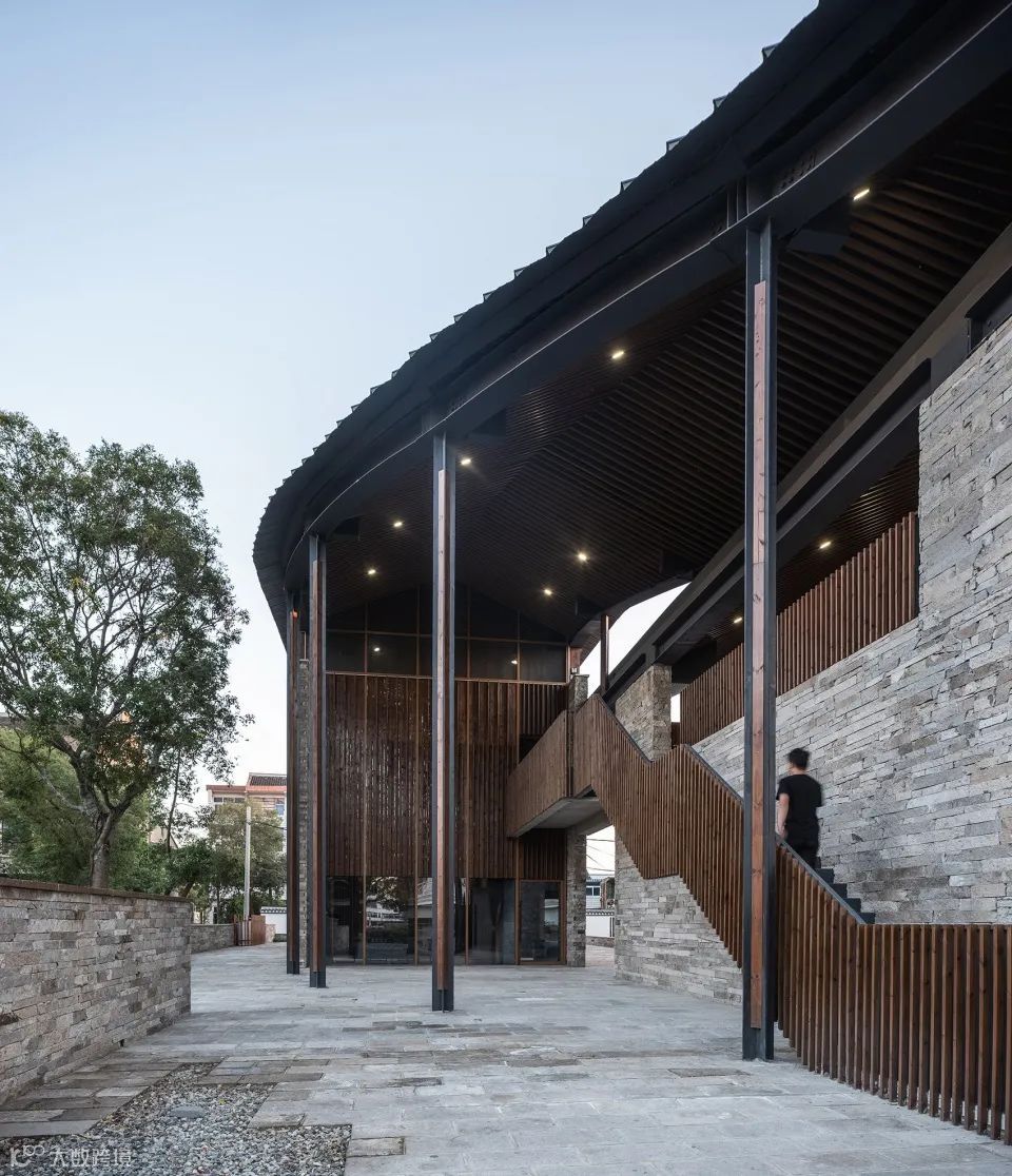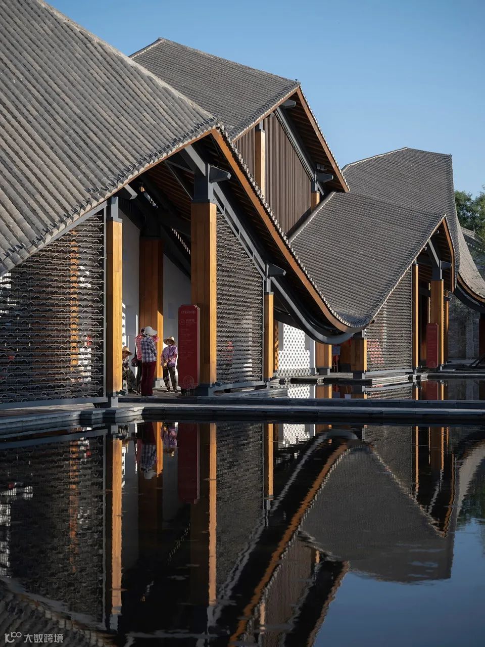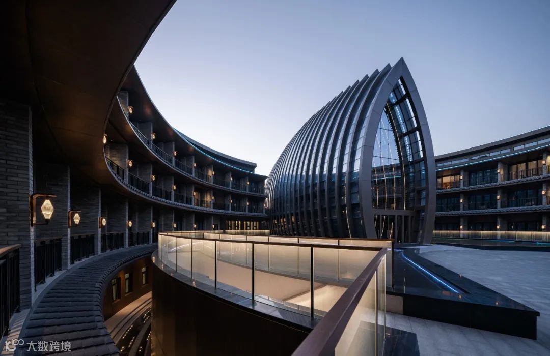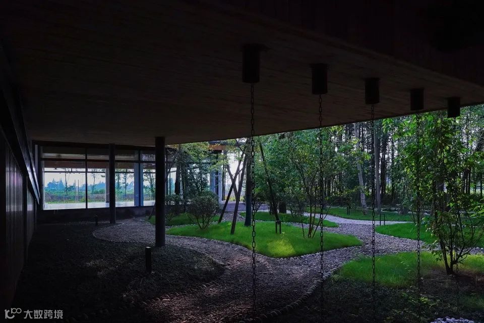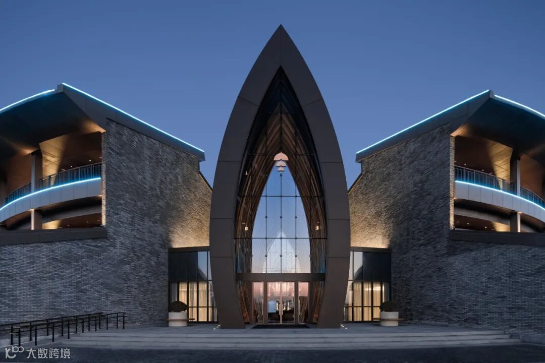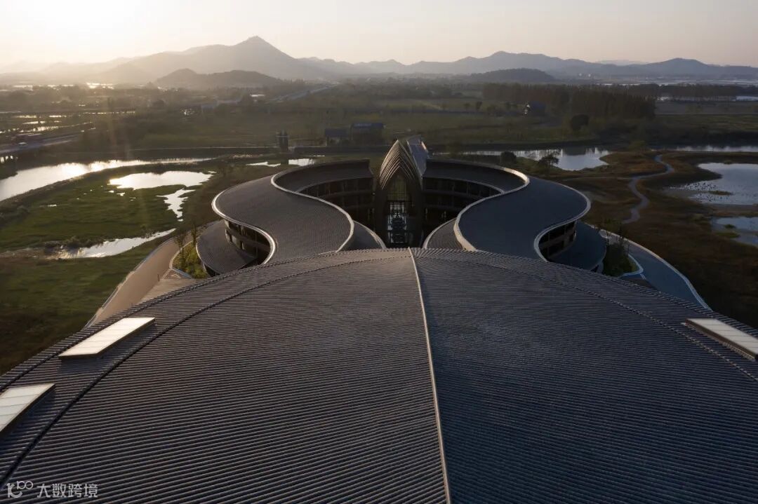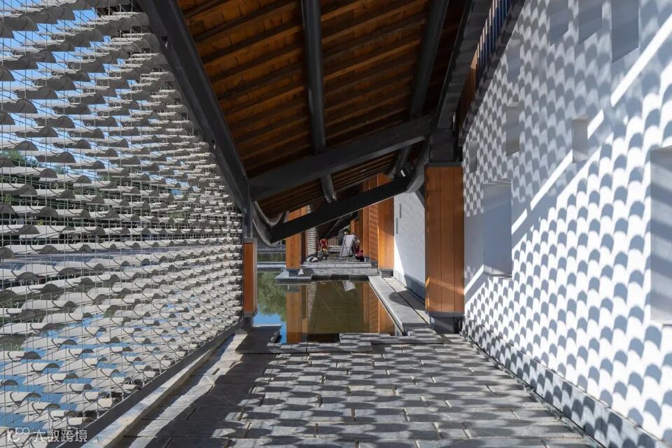 蜿蜒的屋顶采用了周边乡村常用的灰瓦屋面,传统的施工方式在这个新的几何形状上,营造出一种时间的累积效果。外部所有的装饰构件都采用深咖啡色,这也是来自于传统建筑的木作色调。整个建筑的高潮,出现在东侧的酒店入口,一个高耸的拱形钢结构序列,如同渐渐打开的扇面。每日朝阳升起,光在大堂的阴影移动中徐徐呈现,最终撒满宁静的水院。