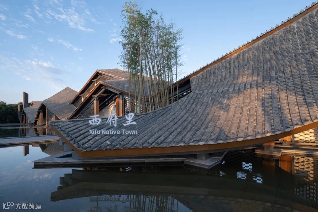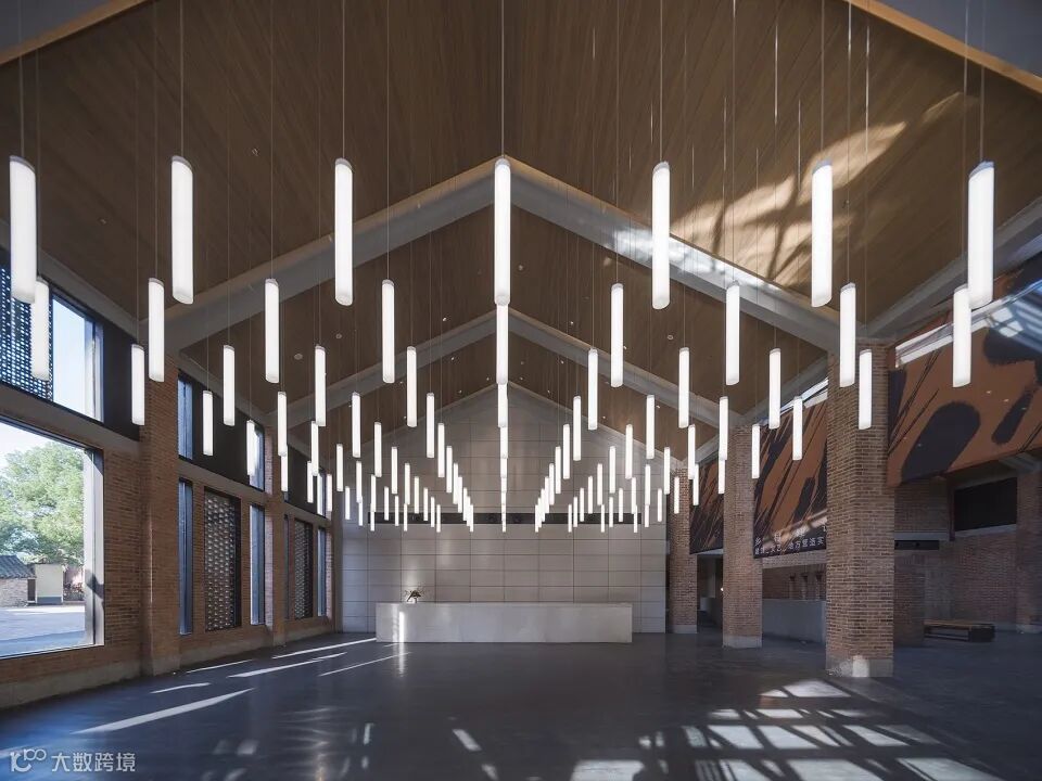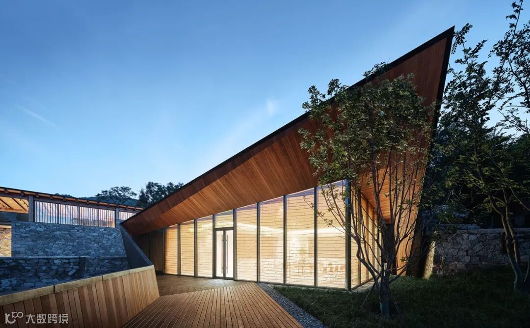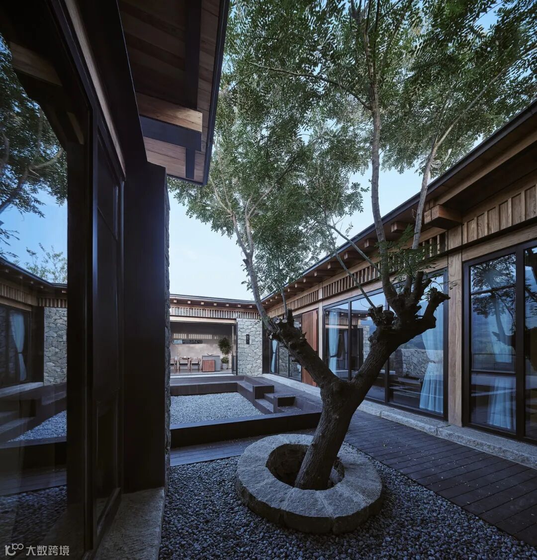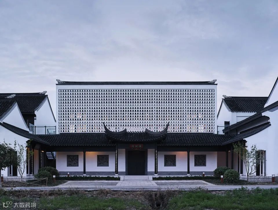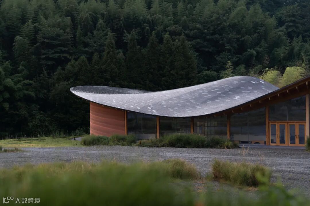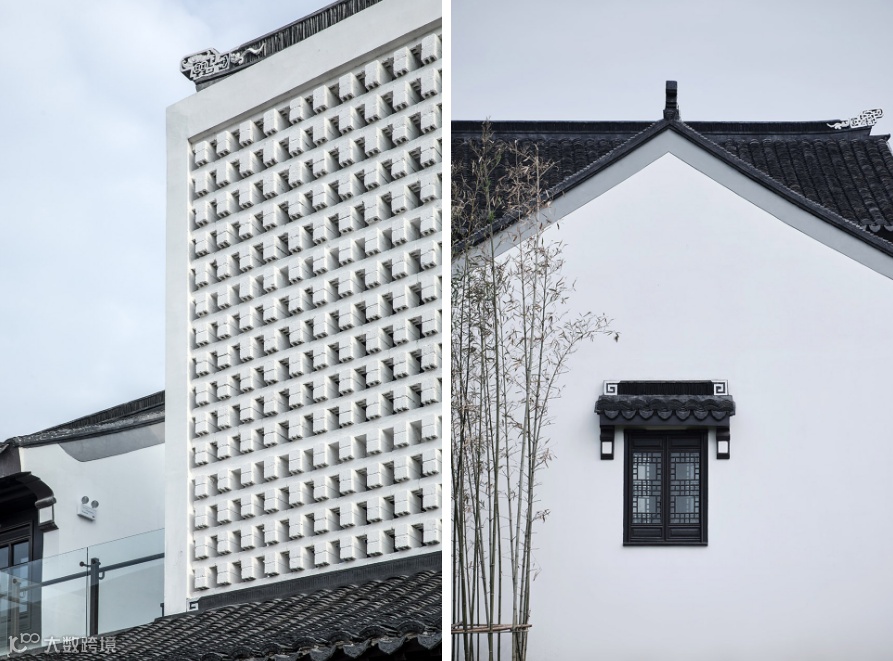 蜿蜒的屋顶采用了周边乡村常用的灰瓦屋面,传统的施工方式在这个新的几何形状上,营造出一种时间的累积效果。外部所有的装饰构件都采用深咖啡色,这也是来自于传统建筑的木作色调。整个建筑的高潮,出现在东侧的酒店入口,一个高耸的拱形钢结构序列,如同渐渐打开的扇面。每日朝阳升起,光在大堂的阴影移动中徐徐呈现,最终撒满宁静的水院。