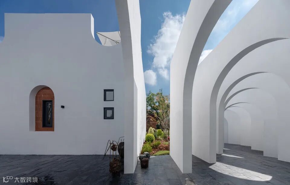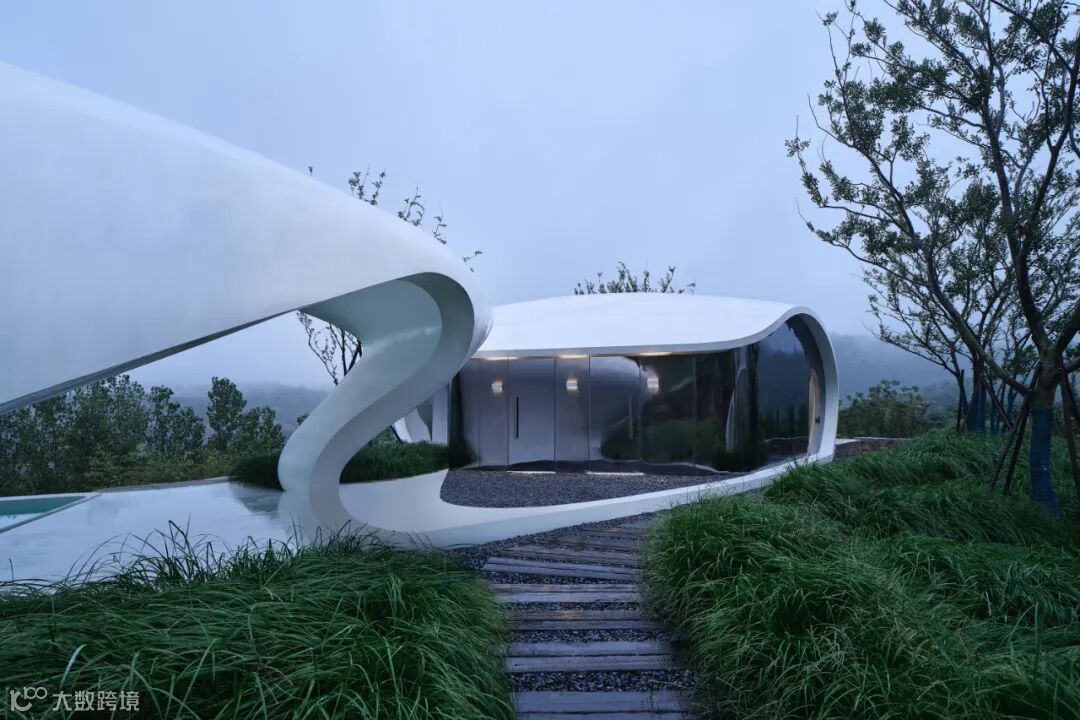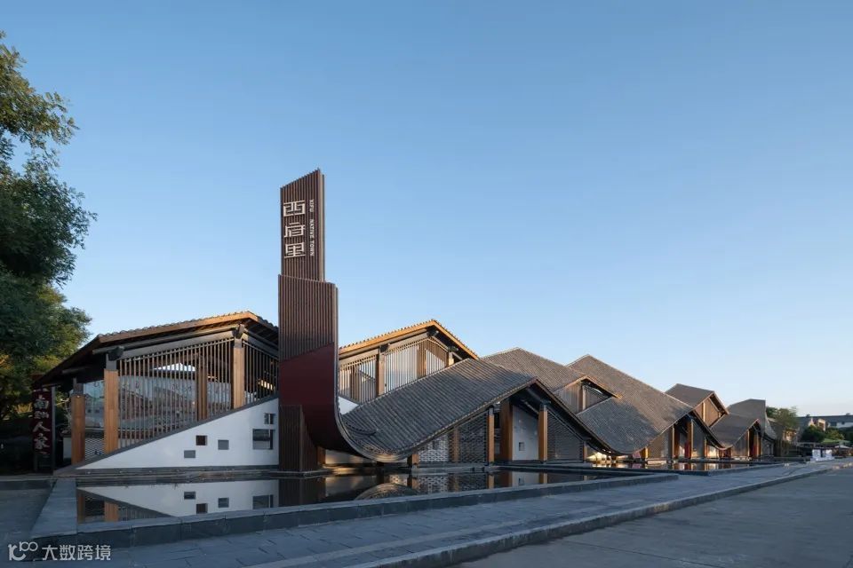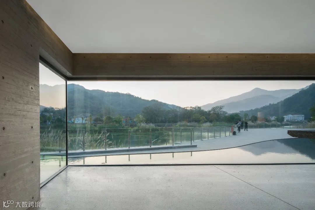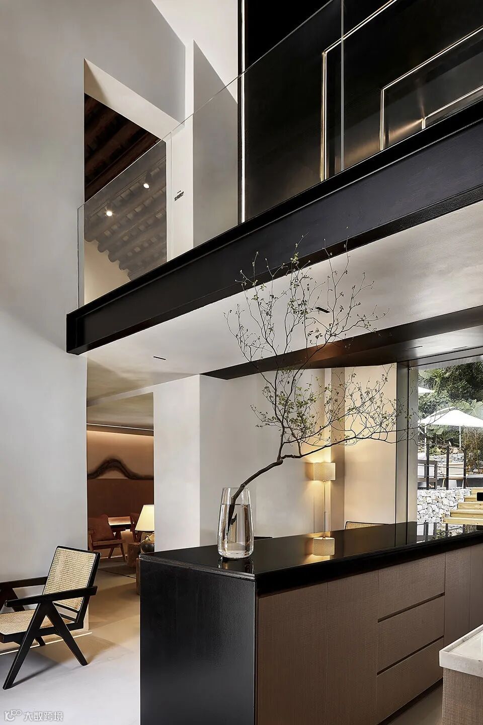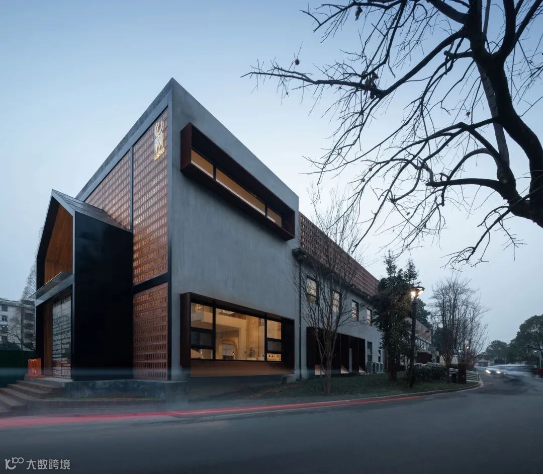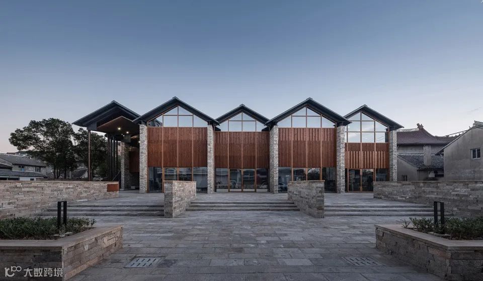 蜿蜒的屋顶采用了周边乡村常用的灰瓦屋面,传统的施工方式在这个新的几何形状上,营造出一种时间的累积效果。外部所有的装饰构件都采用深咖啡色,这也是来自于传统建筑的木作色调。整个建筑的高潮,出现在东侧的酒店入口,一个高耸的拱形钢结构序列,如同渐渐打开的扇面。每日朝阳升起,光在大堂的阴影移动中徐徐呈现,最终撒满宁静的水院。