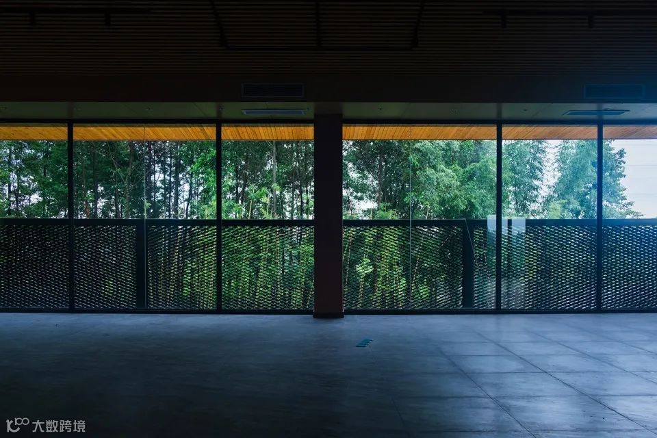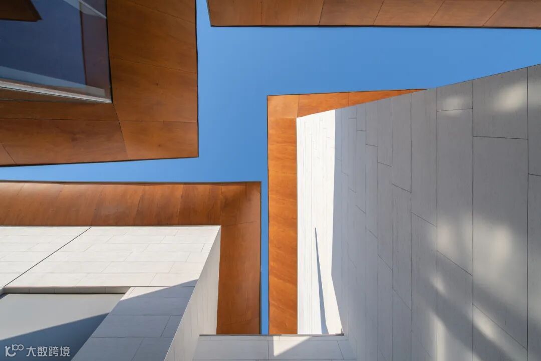 展馆整体为钢结构,门厅和序厅内柱体消隐于幕墙的竖挺中,展厅内钢柱与墙体结合巧妙,内部空间最终以无柱的形式呈现。建筑师在核心功能空间的交汇处置入窄院,将阳光、园景充分引入内部。玻璃与墙体虚实相间,使建筑内外交融,光影纯净而变化丰富。