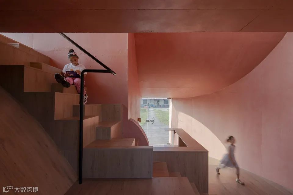 建筑外墙用碳化小木模板支模浇筑勾勒出弧形轮廓的圆滑线条,建筑内部则用镜面模板浇筑起光滑的室内墙面、迎接天光的洒落。在清晨、正午、黄昏或夜色中,粉色混凝土墙面会因为不同光线而呈现出不同的颜色状态。