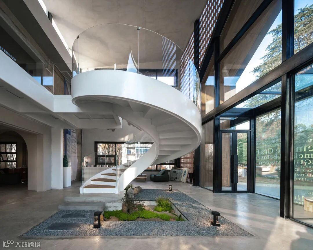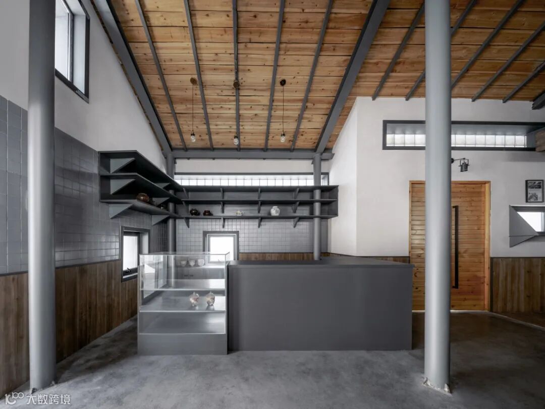 由北向南拾级而下的五个空间依次由接待区、展示区、咖啡区等功能区组成,由空间咬合部分的阶梯与坡道串联。在接待区和最后的咖啡区设置楼梯通往二层,形成完整的交通闭环。建筑东西立面开放且自由,在满足室内展陈需求的前提下,保留了居民视线与龙溪景观的联系。