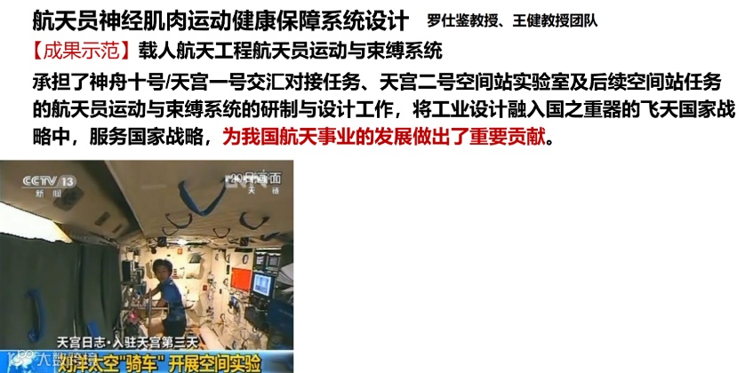 案例1:航天员神经肌肉运动健康保障系统设计,这是我们学院罗仕鉴教授和王健教授制作的。将工业设计融入国之重器的飞天国家战略中,服务国家战略,为我国航天事业的发展做出了重要贡献。