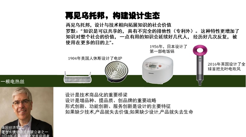 一根电热丝的启示:1904年,美国人修斯发明了电热丝,但缺乏设计和商业化场景。1956年,日本企业基于这个原理设计了世界上第一个电饭煲;2016年,英国戴森基于设计驱动式创新发明了颠覆性的全球首个无叶吹风机。