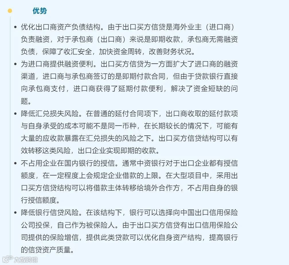出口卖方信贷可为中国出口企业或对外工程承包企业实现即期收汇提供长期限、低利率的外币融资,且一般资金不出境,避免受外汇政策影响。