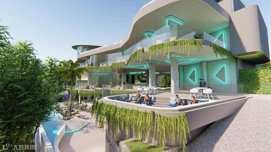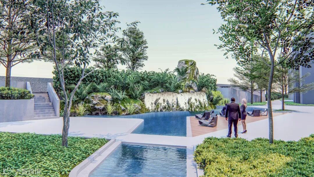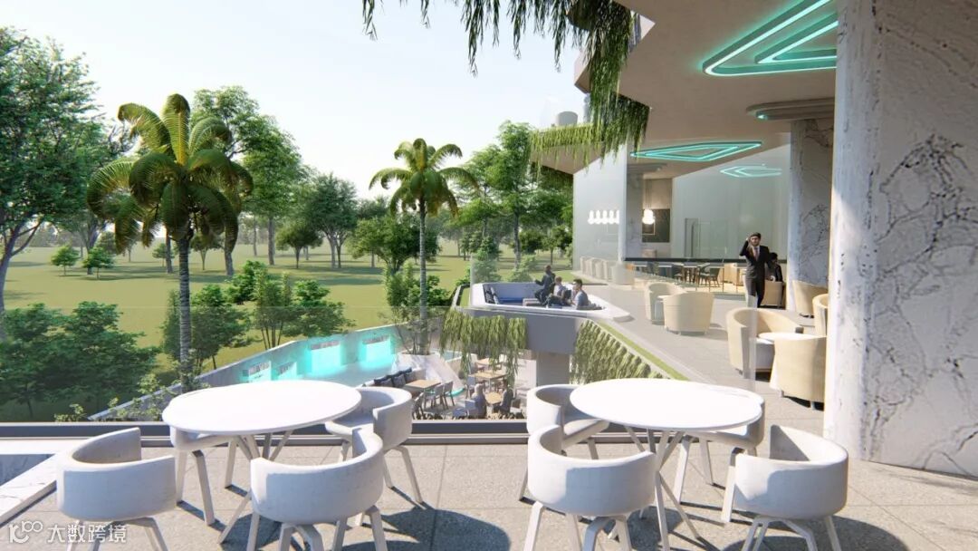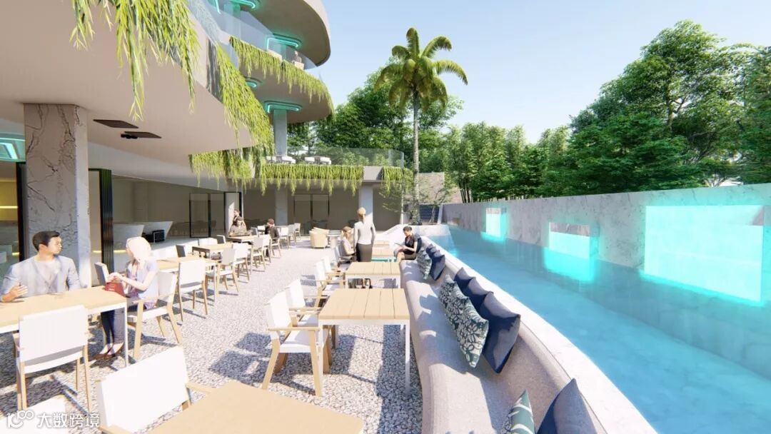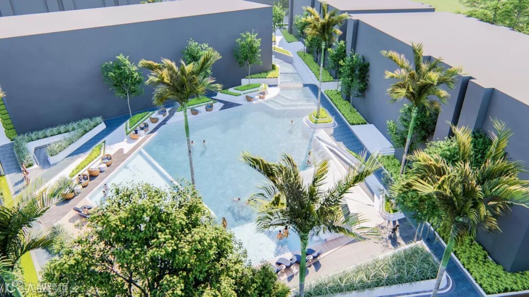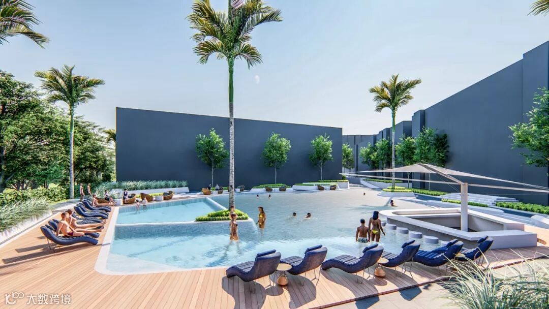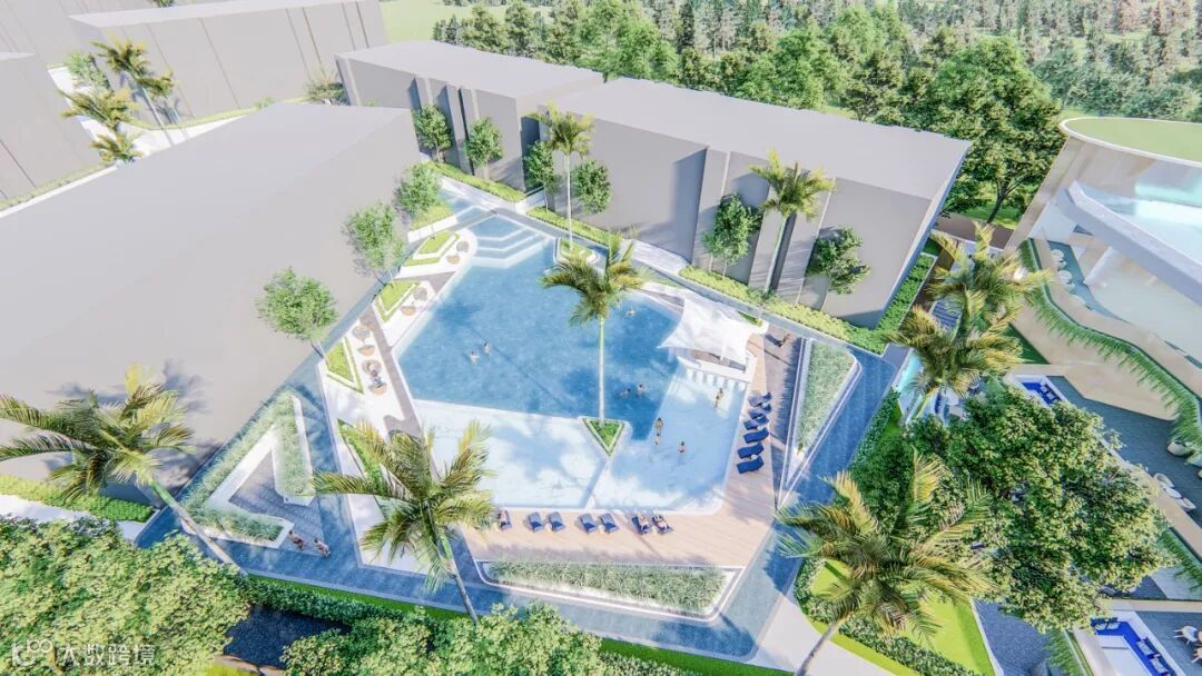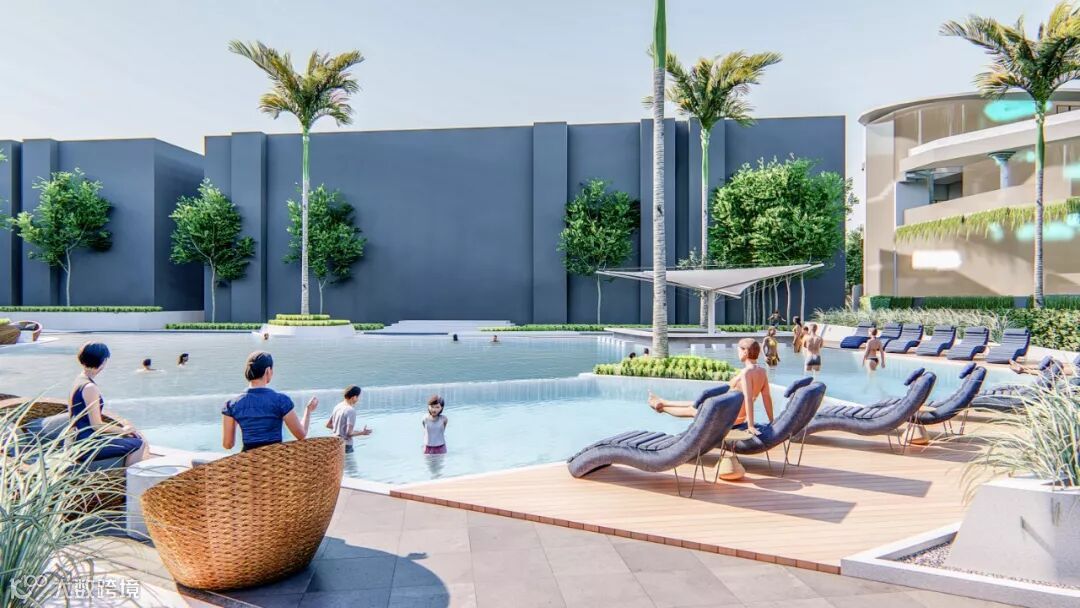 在酒店大堂旁边,打造社区专属的大型户外泳池。岸边设有宽敞的木质甲板休息区与下沉式水中吧台,四处以低矮的绿丛与高挺的棕榈树落错点缀,形成自然与生活和谐共生的景观。