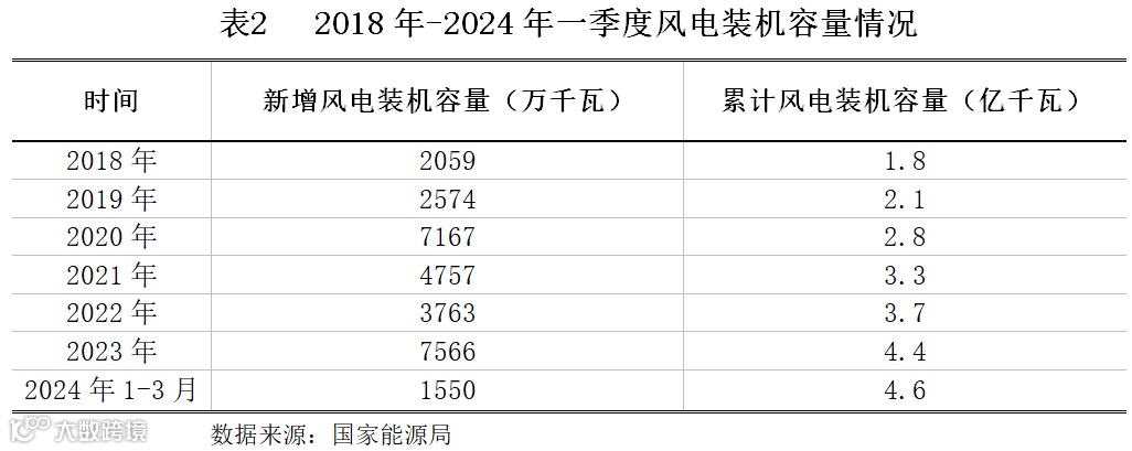 国家统计局发布的数据显示,2024年一季度,全国风电新增并网容量1550万千瓦,其中陆上风电1481万千瓦,海上风电69万千瓦。截至2024年3月底,全国风电累计并网容量达到4.57亿千瓦,同比增长22%,其中陆上风电4.19亿千瓦,海上风电3803万千瓦。