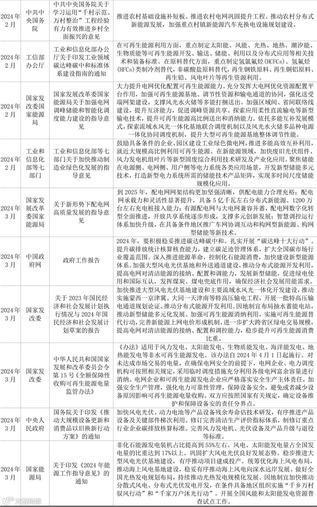 重点政策解读:3月22日,国家能源局印发《2024年能源工作指导意见》。其中目标指出,能源结构持续优化。非化石能源发电装机占比提高到55%左右。风电、太阳能发电量占全国发电量的比重达到17%以上。巩固扩大风电光伏良好发展态势。稳步推进大型风电光伏基地建设,有序推动项目建成投产。统筹优化海上风电布局,推动海上风电基地建设,稳妥有序推动海上风电向深水远岸发展。因地制宜加快推动分散式风电、分布式光伏发电开发,在条件具备地区组织实施“千乡万村驭风行动”和“千家万户沐光行动”。开展全国风能和太阳能发电资源普查试点工作。